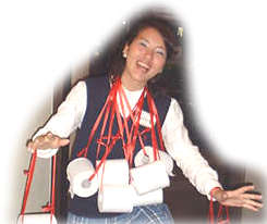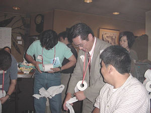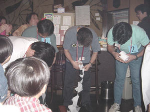ここで、ゲームコーナー。トイレットペーパーを早く巻き取った人が勝ち! みんな、お腹でてるからやりにくそうです!