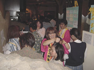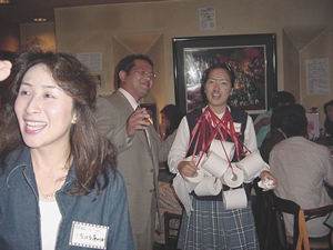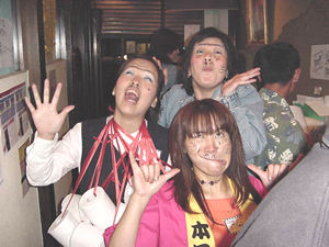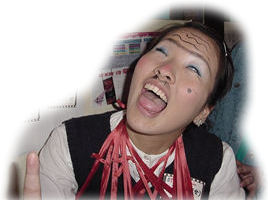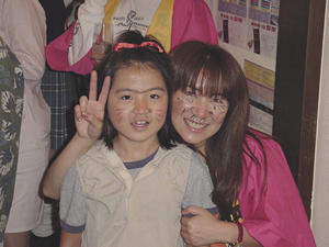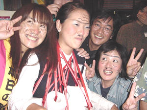 じゃーん!いまいち盛り上がりに欠けると判断した、ヒラの長女まよが、 いきなり「あたし化粧するわ!」といって、こんな顔になって登場! 血は争えん・・・。 しかし、この子を見た恵介さん、一言。「おまえの子、ホンマかわいいな〜」とまじ顔。 どこ見てるンやろ〜。